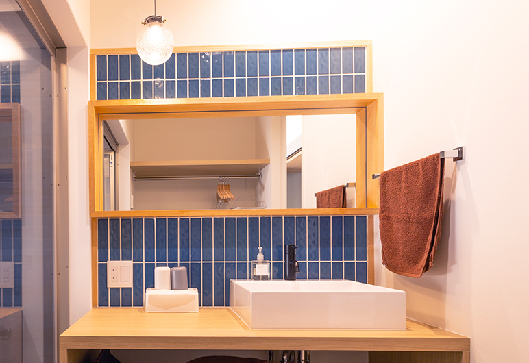 ソファの色は石垣島の海と空をイメージしたセミオーダーのブルー。